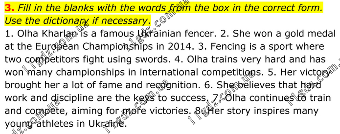 3. Fill in the blanks with the words from the box in the correct form. Use the dictionary if necessary. 1. Olha Kharlan is a famous Ukrainian fencer. 2. She won a gold medal at the European Championships in 2014. 3. Fencing is a sport where two competitors fight using swords. 4. Olha trains very hard and has won many championships in international competitions. 5. Her victory brought her a lot of fame and recognition. 6. She believes that hard work and discipline are the keys to success. 7. Olha continues to train and compete, aiming for more victories. 8. Her story inspires many young athletes in Ukraine.