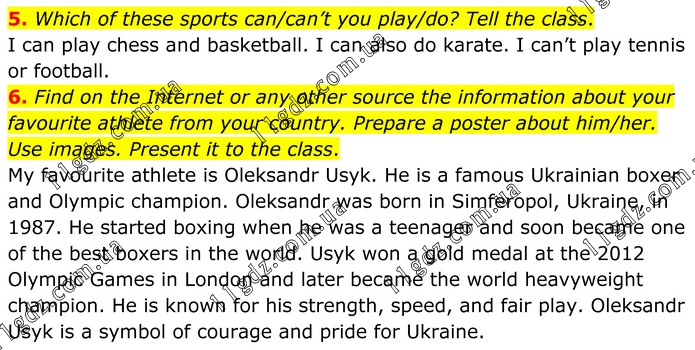 5. Which of these sports can/can’t you play/do? Tell the class. I can play chess and basketball. I can also do karate. I can’t play tennis or football. 6. Find on the Internet or any other source the information about your favourite athlete from your country. Prepare a poster about him/her. Use images. Present it to the class. My favourite athlete is Oleksandr Usyk. He is a famous Ukrainian boxer and Olympic champion. Oleksandr was born in Simferopol, Ukraine, in 1987. He started boxing when he was a teenager and soon became one of the best boxers in the world. Usyk won a gold medal at the 2012 Olympic Games in London and later became the world heavyweight champion. He is known for his strength, speed, and fair play. Oleksandr Usyk is a symbol of courage and pride for Ukraine.