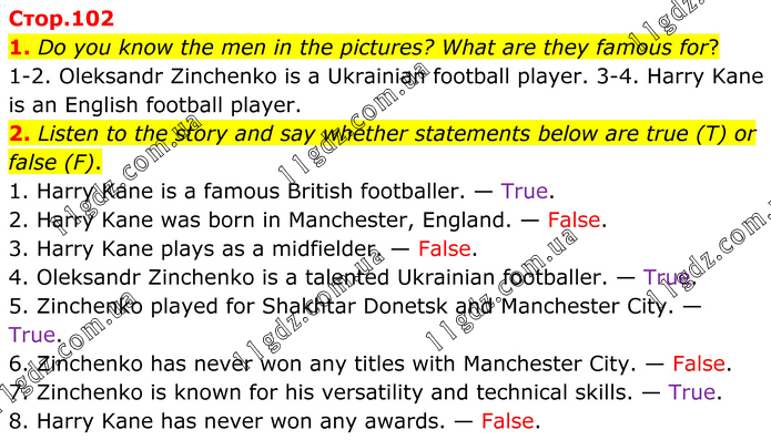 1. Do you know the men in the pictures? What are they famous for? 1-2. Oleksandr Zinchenko is a Ukrainian football player. 3-4. Harry Kane is an English football player. 2. Listen to the story and say whether statements below are true (T) or false (F). 1. Harry Kane is a famous British footballer. — True. 2. Harry Kane was born in Manchester, England. — False. 3. Harry Kane plays as a midfielder. — False. 4. Oleksandr Zinchenko is a talented Ukrainian footballer. — True. 5. Zinchenko played for Shakhtar Donetsk and Manchester City. — True. 6. Zinchenko has never won any titles with Manchester City. — False. 7. Zinchenko is known for his versatility and technical skills. — True. 8. Harry Kane has never won any awards. — False.