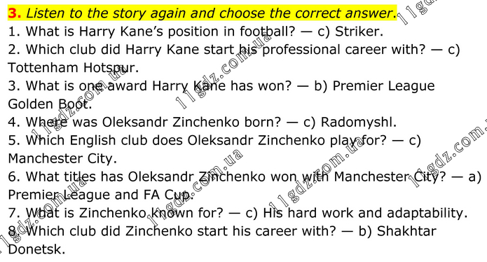 3. Listen to the story again and choose the correct answer. 1. What is Harry Kane’s position in football? — c) Striker. 2. Which club did Harry Kane start his professional career with? — c) Tottenham Hotspur. 3. What is one award Harry Kane has won? — b) Premier League Golden Boot. 4. Where was Oleksandr Zinchenko born? — c) Radomyshl. 5. Which English club does Oleksandr Zinchenko play for? — c) Manchester City. 6. What titles has Oleksandr Zinchenko won with Manchester City? — a) Premier League and FA Cup. 7. What is Zinchenko known for? — c) His hard work and adaptability. 8. Which club did Zinchenko start his career with? — b) Shakhtar Donetsk.