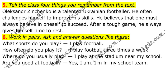 5. Tell the class four things you remember from the text. Oleksandr Zinchenko is a talented Ukrainian footballer. He often challenges himself to improve his skills. He believes that one must always believe in oneself to succeed. After a tough game, he always gives himself time to rest. 6. Work in pairs. Ask and answer questions like these: What sports do you play? — I play football. How often do you play it? — I play football three times a week. Where do you usually play? — I play at the stadium near my school. Are you good at football? — Yes, I am. I’m in my school team.