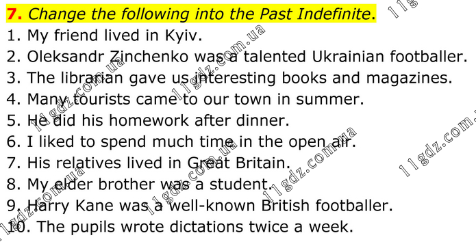 7. Change the following into the Past Indefinite. 1. My friend lived in Kyiv. 2. Oleksandr Zinchenko was a talented Ukrainian footballer. 3. The librarian gave us interesting books and magazines. 4. Many tourists came to our town in summer. 5. He did his homework after dinner. 6. I liked to spend much time in the open air. 7. His relatives lived in Great Britain. 8. My elder brother was a student. 9. Harry Kane was a well-known British footballer. 10. The pupils wrote dictations twice a week.
