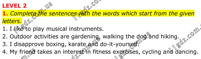 LEVEL 2 1. Complete the sentences with the words which start from the given letters. 1. I like to play musical instruments. 2. Outdoor activities are gardening, walking the dog and hiking. 3. I disapprove boxing, karate and do-it-yourself. 4. My friend takes an interest in fitness exercises, cycling and dancing.