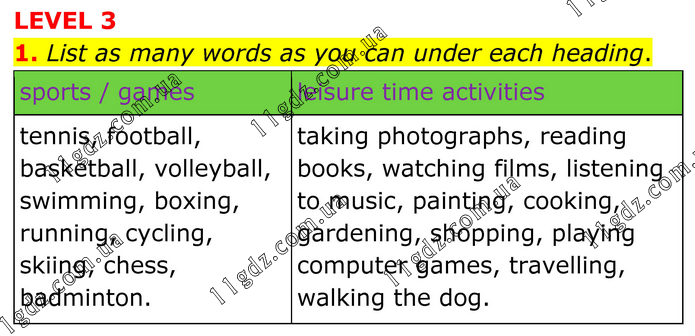 LEVEL 3 1. List as many words as you can under each heading. sports / games leisure time activities tennis, football, basketball, volleyball, swimming, boxing, running, cycling, skiing, chess, badminton. taking photographs, reading books, watching films, listening to music, painting, cooking, gardening, shopping, playing computer games, travelling, walking the dog.