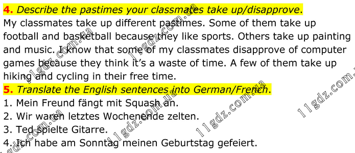 4. Describe the pastimes your classmates take up/disapprove. My classmates take up different pastimes. Some of them take up football and basketball because they like sports. Others take up painting and music. I know that some of my classmates disapprove of computer games because they think it’s a waste of time. A few of them take up hiking and cycling in their free time. 5. Translate the English sentences into German/French. 1. Mein Freund fängt mit Squash an. 2. Wir waren letztes Wochenende zelten. 3. Ted spielte Gitarre. 4. Ich habe am Sonntag meinen Geburtstag gefeiert.