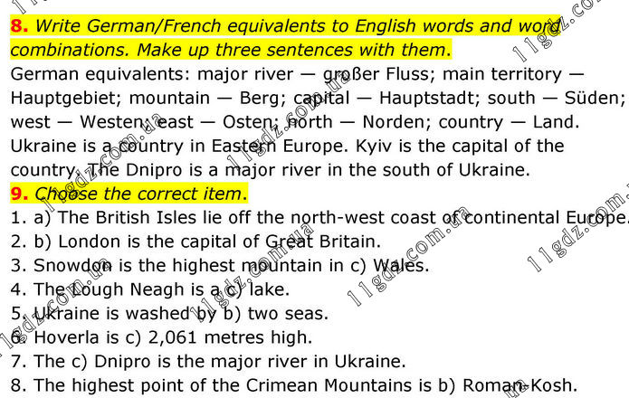 8. Write German/French equivalents to English words and word combinations. Make up three sentences with them. German equivalents: major river — großer Fluss; main territory — Hauptgebiet; mountain — Berg; capital — Hauptstadt; south — Süden; west — Westen; east — Osten; north — Norden; country — Land. Ukraine is a country in Eastern Europe. Kyiv is the capital of the country. The Dnipro is a major river in the south of Ukraine. 9. Choose the correct item. 1. a) The British Isles lie off the north-west coast of continental Europe. 2. b) London is the capital of Great Britain. 3. Snowdon is the highest mountain in c) Wales. 4. The Lough Neagh is a c) lake. 5. Ukraine is washed by b) two seas. 6. Hoverla is c) 2,061 metres high. 7. The c) Dnipro is the major river in Ukraine. 8. The highest point of the Crimean Mountains is b) Roman-Kosh.