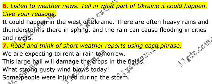 6. Listen to weather news. Tell in what part of Ukraine it could happen. Give your reasons. It could happen in the west of Ukraine. There are often heavy rains and thunderstorms there in spring, and the rain can cause flooding in cities and rivers. 7. Read and think of short weather reports using each phrase. We are expecting torrential rain tomorrow. This large hail will damage the crops in the fields. What strong gusty wind blows today! Some people were injured during the storm.