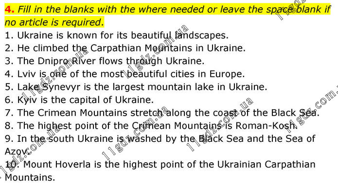 4. Fill in the blanks with the where needed or leave the space blank if no article is required. 1. Ukraine is known for its beautiful landscapes. 2. He climbed the Carpathian Mountains in Ukraine. 3. The Dnipro River flows through Ukraine. 4. Lviv is one of the most beautiful cities in Europe. 5. Lake Synevyr is the largest mountain lake in Ukraine. 6. Kyiv is the capital of Ukraine. 7. The Crimean Mountains stretch along the coast of the Black Sea. 8. The highest point of the Crimean Mountains is Roman-Kosh. 9. In the south Ukraine is washed by the Black Sea and the Sea of Azov. 10. Mount Hoverla is the highest point of the Ukrainian Carpathian Mountains.