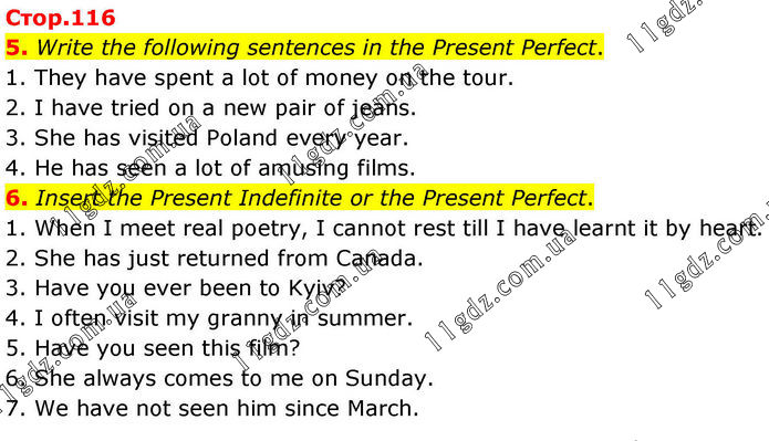 5. Write the following sentences in the Present Perfect. 1. They have spent a lot of money on the tour. 2. I have tried on a new pair of jeans. 3. She has visited Poland every year. 4. He has seen a lot of amusing films. 6. Insert the Present Indefinite or the Present Perfect. 1. When I meet real poetry, I cannot rest till I have learnt it by heart. 2. She has just returned from Canada. 3. Have you ever been to Kyiv? 4. I often visit my granny in summer. 5. Have you seen this film? 6. She always comes to me on Sunday. 7. We have not seen him since March.