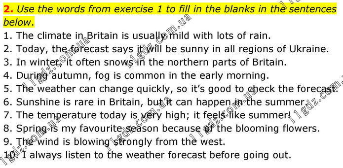 2. Use the words from exercise 1 to fill in the blanks in the sentences below. 1. The climate in Britain is usually mild with lots of rain. 2. Today, the forecast says it will be sunny in all regions of Ukraine. 3. In winter, it often snows in the northern parts of Britain. 4. During autumn, fog is common in the early morning. 5. The weather can change quickly, so it’s good to check the forecast. 6. Sunshine is rare in Britain, but it can happen in the summer. 7. The temperature today is very high; it feels like summer! 8. Spring is my favourite season because of the blooming flowers. 9. The wind is blowing strongly from the west. 10. I always listen to the weather forecast before going out.