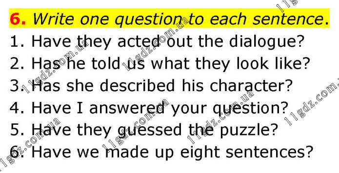 6. Write one question to each sentence. 1. Have they acted out the dialogue? 2. Has he told us what they look like? 3. Has she described his character? 4. Have I answered your question? 5. Have they guessed the puzzle? 6. Have we made up eight sentences?