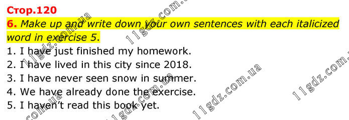 6. Make up and write down your own sentences with each italicized word in exercise 5. 1. I have just finished my homework. 2. I have lived in this city since 2018. 3. I have never seen snow in summer. 4. We have already done the exercise. 5. I haven’t read this book yet.