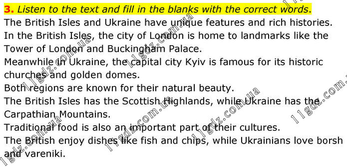 3. Listen to the text and fill in the blanks with the correct words. The British Isles and Ukraine have unique features and rich histories. In the British Isles, the city of London is home to landmarks like the Tower of London and Buckingham Palace. Meanwhile in Ukraine, the capital city Kyiv is famous for its historic churches and golden domes. Both regions are known for their natural beauty. The British Isles has the Scottish Highlands, while Ukraine has the Carpathian Mountains. Traditional food is also an important part of their cultures. The British enjoy dishes like fish and chips, while Ukrainians love borsh and vareniki.
