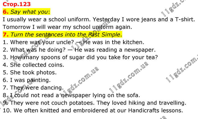 6. Say what you: I usually wear a school uniform. Yesterday I wore jeans and a T-shirt. Tomorrow I will wear my school uniform again. 7. Turn the sentences into the Past Simple. 1. Where was your uncle? — He was in the kitchen. 2. What was he doing? — He was reading a newspaper. 3. How many spoons of sugar did you take for your tea? 4. She collected coins. 5. She took photos. 6. I was painting. 7. They were dancing. 8. I could not read a newspaper lying on the sofa. 9. They were not couch potatoes. They loved hiking and travelling. 10. We often knitted and embroidered at our Handicrafts lessons.
