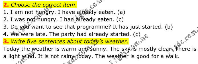 2. Choose the correct item. 1. I am not hungry. I have already eaten. (a) 2. I was not hungry. I had already eaten. (c) 3. Do you want to see that programme? It has just started. (b) 4. We were late. The party had already started. (c) 3. Write five sentences about today’s weather. Today the weather is warm and sunny. The sky is mostly clear. There is a light wind. It is not rainy today. The weather is good for a walk.