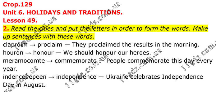 Unit 6. HOLIDAYS AND TRADITIONS. Lesson 49. 2. Read the clues and put the letters in order to form the words. Make up sentences with these words. claproim → proclaim — They proclaimed the results in the morning. houron → honour — We should honour our heroes. meramocomte → commemorate — People commemorate this day every year. indencedepeen → independence — Ukraine celebrates Independence Day in August.