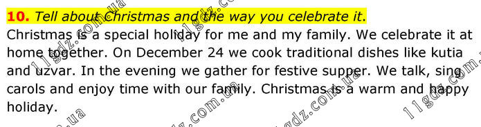 10. Tell about Christmas and the way you celebrate it. Christmas is a special holiday for me and my family. We celebrate it at home together. On December 24 we cook traditional dishes like kutia and uzvar. In the evening we gather for festive supper. We talk, sing carols and enjoy time with our family. Christmas is a warm and happy holiday.