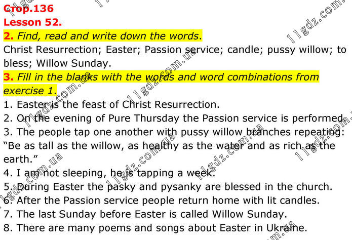Lesson 52. 2. Find, read and write down the words. Christ Resurrection; Easter; Passion service; candle; pussy willow; to bless; Willow Sunday. 3. Fill in the blanks with the words and word combinations from exercise 1. 1. Easter is the feast of Christ Resurrection. 2. On the evening of Pure Thursday the Passion service is performed. 3. The people tap one another with pussy willow branches repeating: “Be as tall as the willow, as healthy as the water and as rich as the earth.” 4. I am not sleeping, he is tapping a week. 5. During Easter the pasky and pysanky are blessed in the church. 6. After the Passion service people return home with lit candles. 7. The last Sunday before Easter is called Willow Sunday. 8. There are many poems and songs about Easter in Ukraine.
