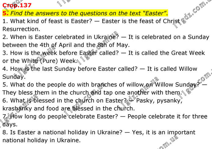 5. Find the answers to the questions on the text “Easter”. 1. What kind of feast is Easter? — Easter is the feast of Christ Resurrection. 2. When is Easter celebrated in Ukraine? — It is celebrated on a Sunday between the 4th of April and the 8th of May. 3. How is the week before Easter called? — It is called the Great Week or the White (Pure) Week. 4. How is the last Sunday before Easter called? — It is called Willow Sunday. 5. What do the people do with branches of willow on Willow Sunday? — They bless them in the church and tap one another with them. 6. What is blessed in the church on Easter? — Pasky, pysanky, krashanky and food are blessed in the church. 7. How long do people celebrate Easter? — People celebrate it for three days. 8. Is Easter a national holiday in Ukraine? — Yes, it is an important national holiday in Ukraine.