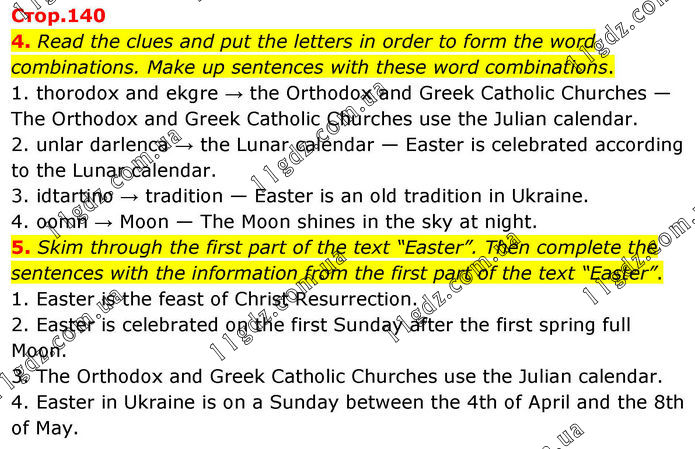 4. Read the clues and put the letters in order to form the word combinations. Make up sentences with these word combinations. 1. thorodox and ekgre → the Orthodox and Greek Catholic Churches — The Orthodox and Greek Catholic Churches use the Julian calendar. 2. unlar darlenca → the Lunar calendar — Easter is celebrated according to the Lunar calendar. 3. idtartino → tradition — Easter is an old tradition in Ukraine. 4. oomn → Moon — The Moon shines in the sky at night. 5. Skim through the first part of the text “Easter”. Then complete the sentences with the information from the first part of the text “Easter”. 1. Easter is the feast of Christ Resurrection. 2. Easter is celebrated on the first Sunday after the first spring full Moon. 3. The Orthodox and Greek Catholic Churches use the Julian calendar. 4. Easter in Ukraine is on a Sunday between the 4th of April and the 8th of May.
