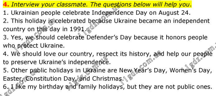 4. Interview your classmate. The questions below will help you. 1. Ukrainian people celebrate Independence Day on August 24. 2. This holiday is celebrated because Ukraine became an independent country on this day in 1991. 3. Yes, we should celebrate Defender’s Day because it honors people who protect Ukraine. 4. We should love our country, respect its history, and help our people to preserve Ukraine’s independence. 5. Other public holidays in Ukraine are New Year’s Day, Women’s Day, Easter, Constitution Day, and Christmas. 6. I like my birthday and family holidays, but they are not public ones.