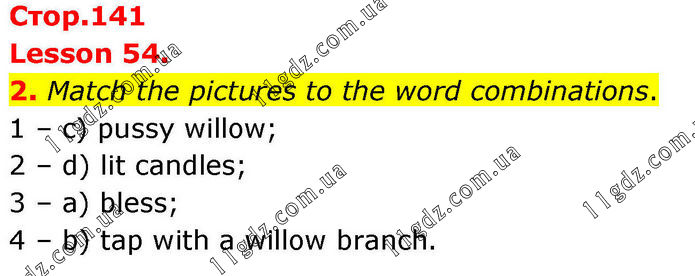 Lesson 54. 2. Match the pictures to the word combinations. 1 – c) pussy willow; 2 – d) lit candles; 3 – a) bless; 4 – b) tap with a willow branch.