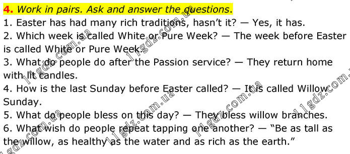 4. Work in pairs. Ask and answer the questions. 1. Easter has had many rich traditions, hasn’t it? — Yes, it has. 2. Which week is called White or Pure Week? — The week before Easter is called White or Pure Week. 3. What do people do after the Passion service? — They return home with lit candles. 4. How is the last Sunday before Easter called? — It is called Willow Sunday. 5. What do people bless on this day? — They bless willow branches. 6. What wish do people repeat tapping one another? — “Be as tall as the willow, as healthy as the water and as rich as the earth.”