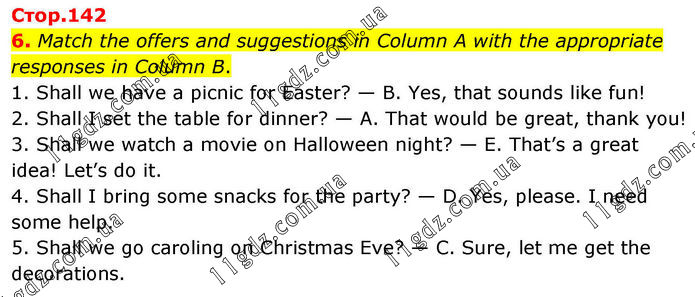 6. Match the offers and suggestions in Column A with the appropriate responses in Column B. 1. Shall we have a picnic for Easter? — B. Yes, that sounds like fun! 2. Shall I set the table for dinner? — A. That would be great, thank you! 3. Shall we watch a movie on Halloween night? — E. That’s a great idea! Let’s do it. 4. Shall I bring some snacks for the party? — D. Yes, please. I need some help. 5. Shall we go caroling on Christmas Eve? — C. Sure, let me get the decorations.
