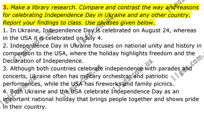 3. Make a library research. Compare and contrast the way and reasons for celebrating Independence Day in Ukraine and any other country. Report your findings to class. Use phrases given below. 1. In Ukraine, Independence Day is celebrated on August 24, whereas in the USA it is celebrated on July 4. 2. Independence Day in Ukraine focuses on national unity and history in comparison to the USA, where the holiday highlights freedom and the Declaration of Independence. 3. Although both countries celebrate independence with parades and concerts, Ukraine often has military orchestras and patriotic performances, while the USA has fireworks and family picnics. 4. Both Ukraine and the USA celebrate Independence Day as an important national holiday that brings people together and shows pride in their country.