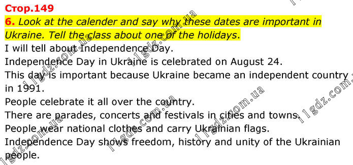 6. Look at the calender and say why these dates are important in Ukraine. Tell the class about one of the holidays. I will tell about Independence Day. Independence Day in Ukraine is celebrated on August 24. This day is important because Ukraine became an independent country in 1991. People celebrate it all over the country. There are parades, concerts and festivals in cities and towns. People wear national clothes and carry Ukrainian flags. Independence Day shows freedom, history and unity of the Ukrainian people.