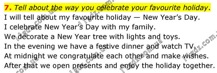 7. Tell about the way you celebrate your favourite holiday. I will tell about my favourite holiday — New Year’s Day. I celebrate New Year’s Day with my family. We decorate a New Year tree with lights and toys. In the evening we have a festive dinner and watch TV. At midnight we congratulate each other and make wishes. After that we open presents and enjoy the holiday together.