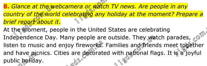 8. Glance at the webcamera or watch TV news. Are people in any country of the world celebrating any holiday at the moment? Prepare a brief report about it. At the moment, people in the United States are celebrating Independence Day. Many people are outside. They watch parades, listen to music and enjoy fireworks. Families and friends meet together and have picnics. Cities are decorated with national flags. It is a joyful public holiday.