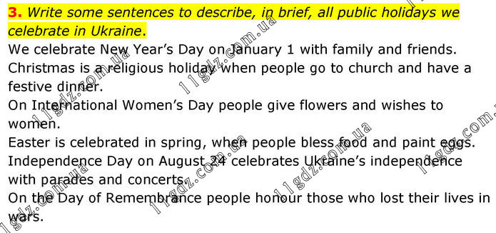 3. Write some sentences to describe, in brief, all public holidays we celebrate in Ukraine. We celebrate New Year’s Day on January 1 with family and friends. Christmas is a religious holiday when people go to church and have a festive dinner. On International Women’s Day people give flowers and wishes to women. Easter is celebrated in spring, when people bless food and paint eggs. Independence Day on August 24 celebrates Ukraine’s independence with parades and concerts. On the Day of Remembrance people honour those who lost their lives in wars.