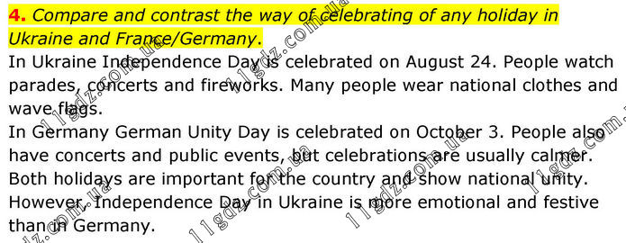 4. Compare and contrast the way of celebrating of any holiday in Ukraine and France/Germany. In Ukraine Independence Day is celebrated on August 24. People watch parades, concerts and fireworks. Many people wear national clothes and wave flags. In Germany German Unity Day is celebrated on October 3. People also have concerts and public events, but celebrations are usually calmer. Both holidays are important for the country and show national unity. However, Independence Day in Ukraine is more emotional and festive than in Germany.