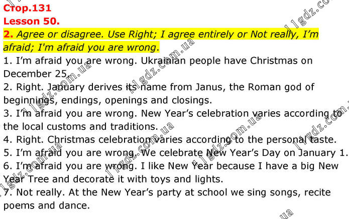 Lesson 50. 2. Agree or disagree. Use Right; I agree entirely or Not really, I’m afraid; I'm afraid you are wrong. 1. I’m afraid you are wrong. Ukrainian people have Christmas on December 25. 2. Right. January derives its name from Janus, the Roman god of beginnings, endings, openings and closings. 3. I’m afraid you are wrong. New Year’s celebration varies according to the local customs and traditions. 4. Right. Christmas celebration varies according to the personal taste. 5. I’m afraid you are wrong. We celebrate New Year’s Day on January 1. 6. I’m afraid you are wrong. I like New Year because I have a big New Year Tree and decorate it with toys and lights. 7. Not really. At the New Year’s party at school we sing songs, recite poems and dance.