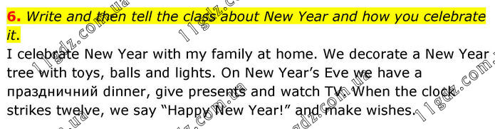 6. Write and then tell the class about New Year and how you celebrate it. I celebrate New Year with my family at home. We decorate a New Year tree with toys, balls and lights. On New Year’s Eve we have a festive dinner, give presents and watch TV. When the clock strikes twelve, we say “Happy New Year!” and make wishes.
