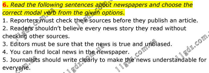 6. Read the following sentences about newspapers and choose the correct modal verb from the given options. 1. Reporters must check their sources before they publish an article. 2. Readers shouldn’t believe every news story they read without checking other sources. 3. Editors must be sure that the news is true and unbiased. 4. You can find local news in the newspaper. 5. Journalists should write clearly to make the news understandable for everyone.