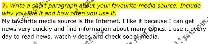 7. Write a short paragraph about your favourite media source. Include why you like it and how often you use it. My favourite media source is the Internet. I like it because I can get news very quickly and find information about many topics. I use it every day to read news, watch videos and check social media.