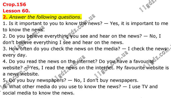 Lesson 60. 2. Answer the following questions. 1. Is it important to you to know the news? — Yes, it is important to me to know the news. 2. Do you believe everything you see and hear on the news? — No, I don’t believe everything I see and hear on the news. 3. How often do you check the news on the media? — I check the news every day. 4. Do you read the news on the internet? Do you have a favourite website? — Yes, I read the news on the internet. My favourite website is a news website. 5. Do you buy newspapers? — No, I don’t buy newspapers. 6. What other media do you use to know the news? — I use TV and social media to know the news.