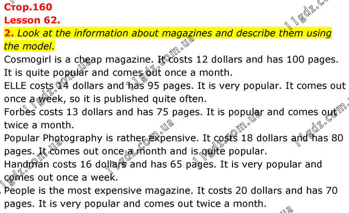 Lesson 62. 2. Look at the information about magazines and describe them using the model. Cosmogirl is a cheap magazine. It costs 12 dollars and has 100 pages. It is quite popular and comes out once a month. ELLE costs 14 dollars and has 95 pages. It is very popular. It comes out once a week, so it is published quite often. Forbes costs 13 dollars and has 75 pages. It is popular and comes out twice a month. Popular Photography is rather expensive. It costs 18 dollars and has 80 pages. It comes out once a month and is quite popular. Handman costs 16 dollars and has 65 pages. It is very popular and comes out once a week. People is the most expensive magazine. It costs 20 dollars and has 70 pages. It is very popular and comes out twice a month.