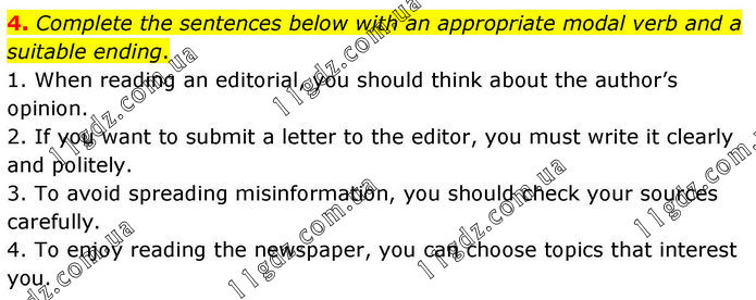 4. Complete the sentences below with an appropriate modal verb and a suitable ending. 1. When reading an editorial, you should think about the author’s opinion. 2. If you want to submit a letter to the editor, you must write it clearly and politely. 3. To avoid spreading misinformation, you should check your sources carefully. 4. To enjoy reading the newspaper, you can choose topics that interest you.
