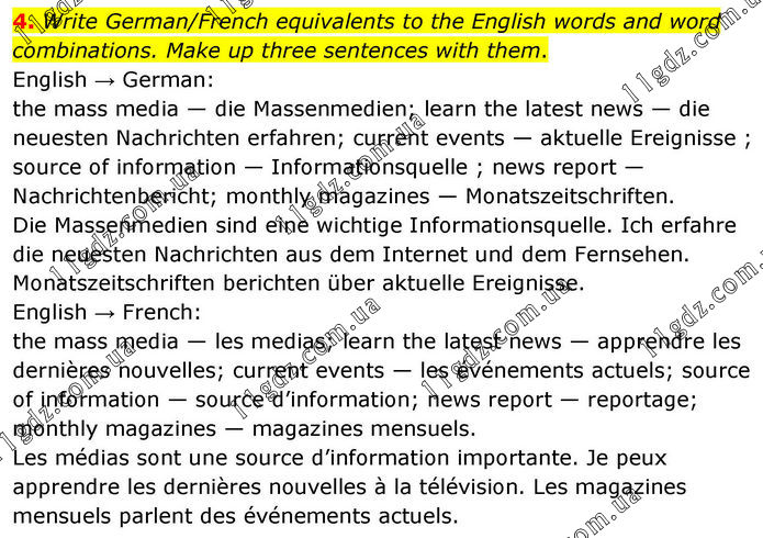 4. Write German/French equivalents to the English words and word combinations. Make up three sentences with them. English → German: the mass media — die Massenmedien; learn the latest news — die neuesten Nachrichten erfahren; current events — aktuelle Ereignisse ; source of information — Informationsquelle ; news report — Nachrichtenbericht; monthly magazines — Monatszeitschriften. Die Massenmedien sind eine wichtige Informationsquelle. Ich erfahre die neuesten Nachrichten aus dem Internet und dem Fernsehen. Monatszeitschriften berichten über aktuelle Ereignisse. English → French: the mass media — les medias; learn the latest news — apprendre les dernières nouvelles; current events — les événements actuels; source of information — source d’information; news report — reportage; monthly magazines — magazines mensuels. Les médias sont une source d’information importante. Je peux apprendre les dernières nouvelles à la télévision. Les magazines mensuels parlent des événements actuels.