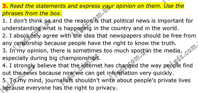 3. Read the statements and express your opinion on them. Use the phrases from the box. 1. I don’t think so and the reason is that political news is important for understanding what is happening in the country and in the world. 2. I absolutely agree with the idea that newspapers should be free from any censorship because people have the right to know the truth. 3. In my opinion, there is sometimes too much sport in the media, especially during big championships. 4. I strongly believe that the internet has changed the way people find out the news because now we can get information very quickly. 5. To my mind, journalists shouldn’t write about people’s private lives because everyone has the right to privacy.