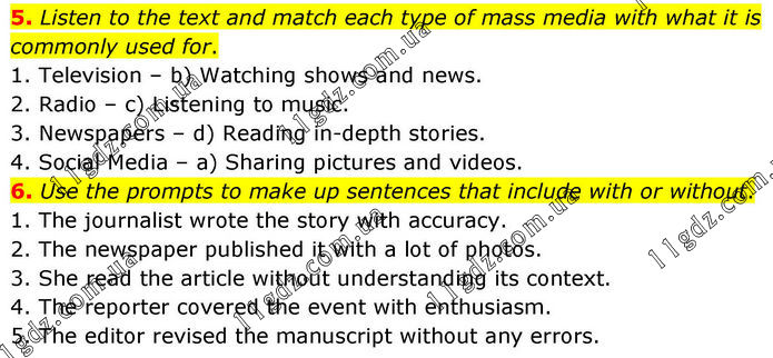 5. Listen to the text and match each type of mass media with what it is commonly used for. 1. Television – b) Watching shows and news. 2. Radio – c) Listening to music. 3. Newspapers – d) Reading in-depth stories. 4. Social Media – a) Sharing pictures and videos. 6. Use the prompts to make up sentences that include with or without. 1. The journalist wrote the story with accuracy. 2. The newspaper published it with a lot of photos. 3. She read the article without understanding its context. 4. The reporter covered the event with enthusiasm. 5. The editor revised the manuscript without any errors.