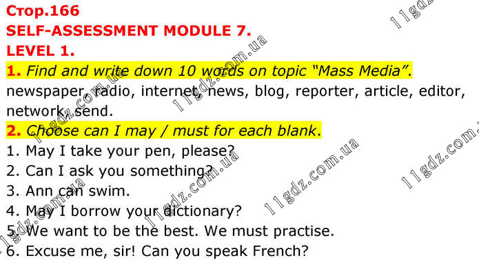 SELF-ASSESSMENT MODULE 7. LEVEL 1. 1. Find and write down 10 words on topic “Mass Media”. newspaper, radio, internet, news, blog, reporter, article, editor, network, send. 2. Choose can I may / must for each blank. 1. May I take your pen, please? 2. Can I ask you something? 3. Ann can swim. 4. May I borrow your dictionary? 5. We want to be the best. We must practise. 6. Excuse me, sir! Can you speak French?