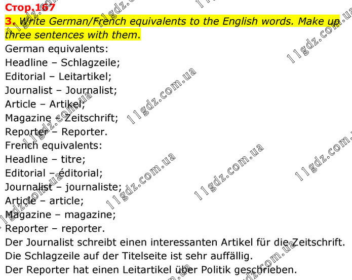3. Write German/French equivalents to the English words. Make up three sentences with them. German equivalents: Headline – Schlagzeile; Editorial – Leitartikel; Journalist – Journalist; Article – Artikel; Magazine – Zeitschrift; Reporter – Reporter. French equivalents: Headline – titre; Editorial – éditorial; Journalist – journaliste; Article – article; Magazine – magazine; Reporter – reporter. Der Journalist schreibt einen interessanten Artikel für die Zeitschrift. Die Schlagzeile auf der Titelseite ist sehr auffällig. Der Reporter hat einen Leitartikel über Politik geschrieben.