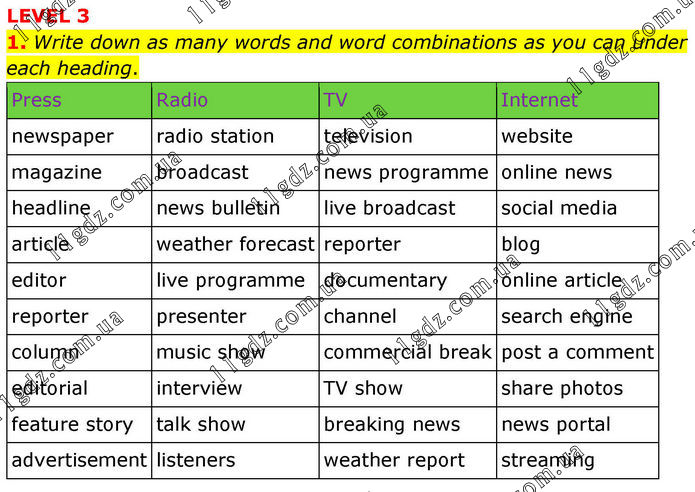 LEVEL 3 1. Write down as many words and word combinations as you can under each heading.