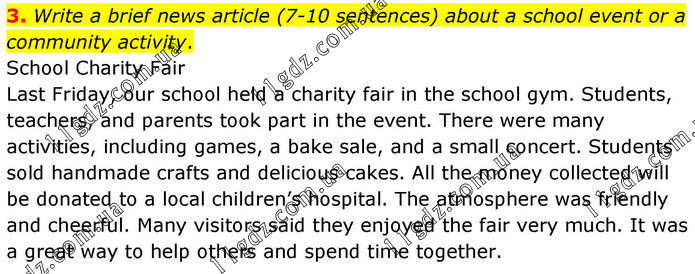 3. Write a brief news article (7-10 sentences) about a school event or a community activity. School Charity Fair Last Friday, our school held a charity fair in the school gym. Students, teachers, and parents took part in the event. There were many activities, including games, a bake sale, and a small concert. Students sold handmade crafts and delicious cakes. All the money collected will be donated to a local children’s hospital. The atmosphere was friendly and cheerful. Many visitors said they enjoyed the fair very much. It was a great way to help others and spend time together.