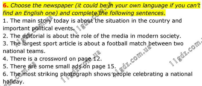 6. Choose the newspaper (it could be in your own language if you can’t find an English one) and complete the following sentences. 1. The main story today is about the situation in the country and important political events. 2. The editorial is about the role of the media in modern society. 3. The largest sport article is about a football match between two national teams. 4. There is a crossword on page 12. 5. There are some small ads on page 15. 6. The most striking photograph shows people celebrating a national holiday.