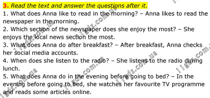 3. Read the text and answer the questions after it. 1. What does Anna like to read in the morning? – Anna likes to read the newspaper in the morning. 2. Which section of the newspaper does she enjoy the most? – She enjoys the local news section the most. 3. What does Anna do after breakfast? – After breakfast, Anna checks her social media accounts. 4. When does she listen to the radio? – She listens to the radio during lunch. 5. What does Anna do in the evening before going to bed? – In the evening before going to bed, she watches her favourite TV programme and reads some articles online.